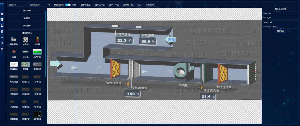 通過搭建組態(tài)環(huán)境,與現(xiàn)實采集設(shè)備進行邏輯關(guān)聯(lián),結(jié)合三維地圖,將工業(yè)生產(chǎn)過程直觀的展現(xiàn)給用戶,通過設(shè)計相關(guān)工業(yè)生產(chǎn)邏輯規(guī)范,及預(yù)警參數(shù),能夠?qū)崟r進行監(jiān)控展示,對于異常情況能夠第一時間展示在基于三維的自動控制系統(tǒng)中。